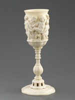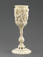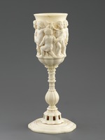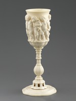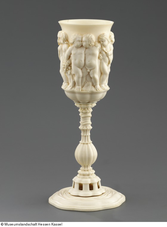 Elfenbein, gedrechselt, gesägt, geschnitzt und poliert. Drei Teile, Fuß, Nodus und Kelch mit Gewinde miteinander verschraubt.