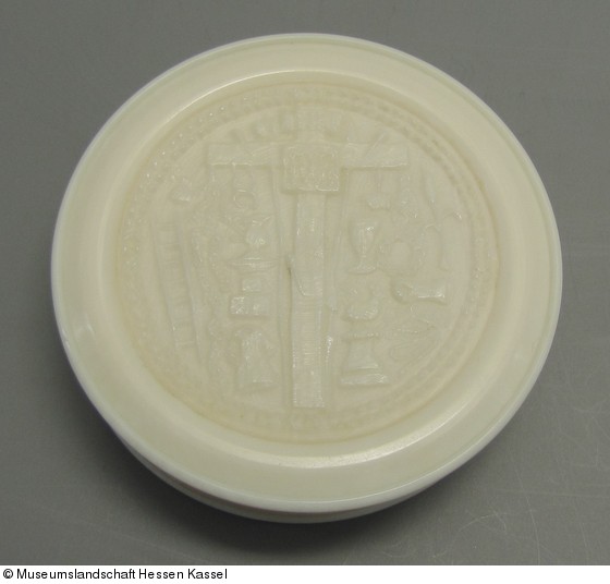 Rundes Döschen mit den Leidenswerkzeugen Christi auf dem Deckel