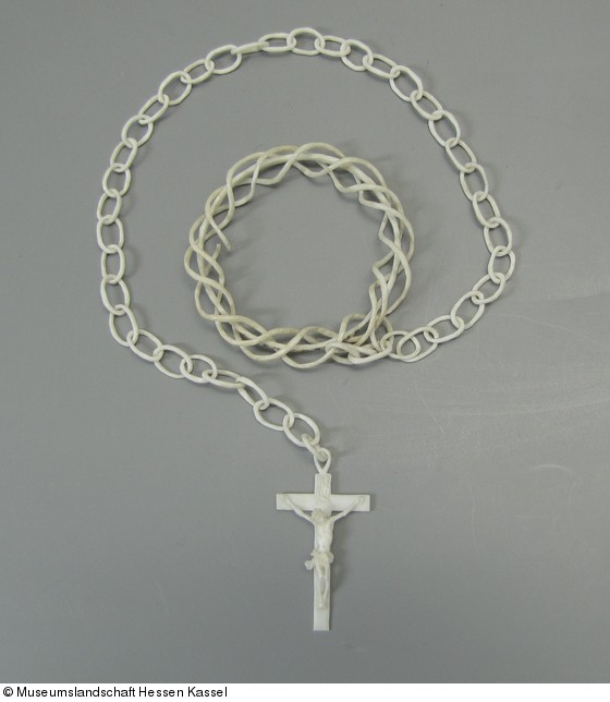 Kette 25,6 cm (Länge) Kranz 4,3 cm (Durchmesser) Kruzifix 3,3 cm (Höhe)