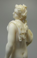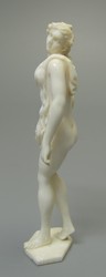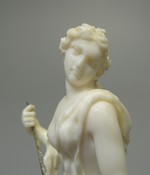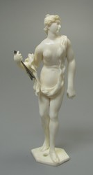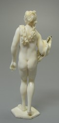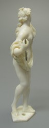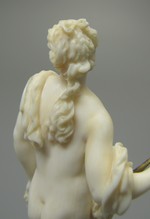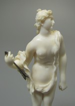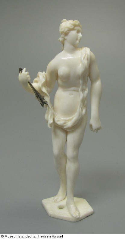 "Auf sechskantiger Fußplatte, mit zurückgestelltem rechten Fuss, schreitend. Der Kopf nach l. gewandt. Von der rechten, hochgezogenen Schulter fällt ein Schleierüber die Scham der vom rechten Unterarm wieder aufgenommen wird. In der Rechten ein Pfeil. Das Attribut das die herabhängende Linke hielt fehlt."