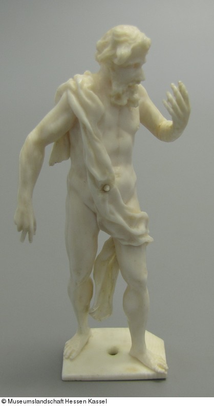 "Auf sechskantiger Fußplatte schreitet, mit vorgesetztem linken Fuß ein bärtiger Greis mit weitgeöffnetem Mund. Die Linke erhoben, die Rechte gesenkt. Von der rechten Schulter hängt ein Tuch über die Brust und schlägt sich um den l. Oberschenkel. Auf dem Tuch ein kl. Dübel an dem ein, von der Linken gehaltener Gegenstand befestigt war. 2 Finger der rechten Hand fehlen. In der Fußplatte ein Bohrloch. Alt. Inv. Verm. Saturn."