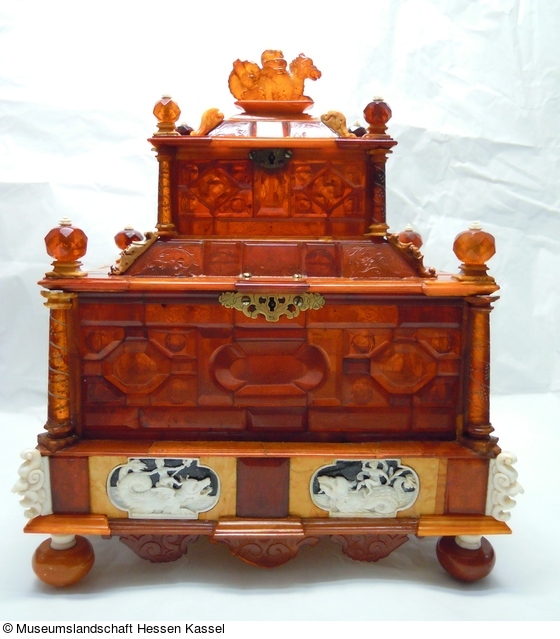 Doppeletagiges Bernsteinkästchen mit Drachen auf dem Deckel