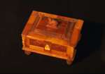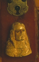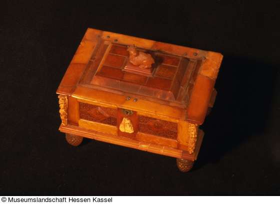 Bernsteinkasten mit Reliefbild des Großen Kurfürsten (Vorderseite) und seiner Gemahlin (Rückseite) sowie mit Kuh auf dem Deckel