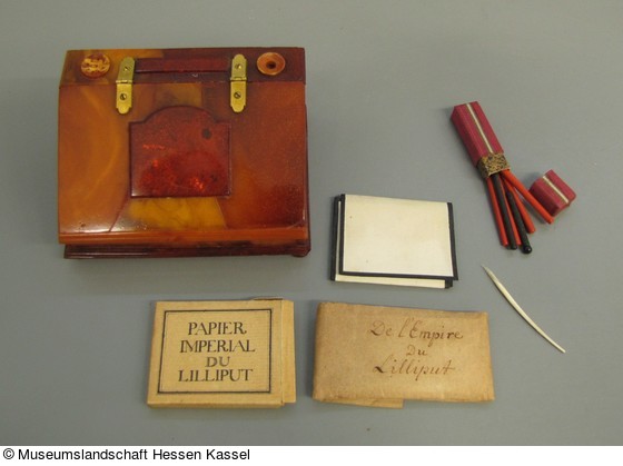 Bernstein, Kupferlegierung vergoldet, Goldfolie, Papier (3 Heftchen), Fedekiel, Textil, Wachs-Harzmischung? (4 Stäbe rot, 2 Stäbe schwarz) |