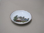 Deckeltasse mit Bauernhof und Untertasse mit Ruine an Teich