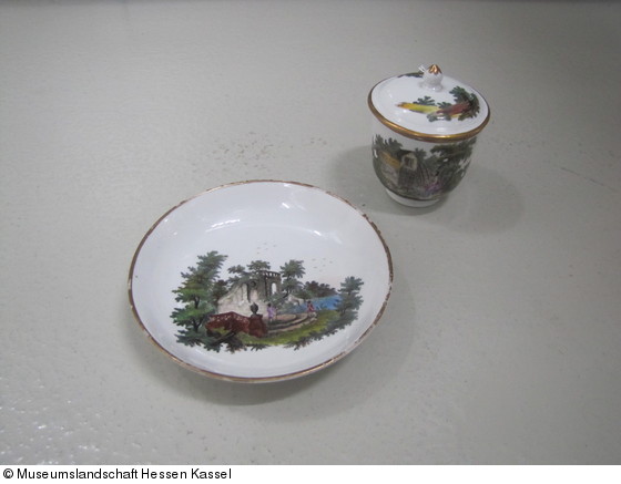 Tasse: 6,5 x 7 x 9,8 cm (Objektmaß) Untertasse: 2,8 x 13,7 x 13,7 cm (Objektmaß) Deckel: 3,6 x 7,6 x 7,6 cm (Objektmaß)
