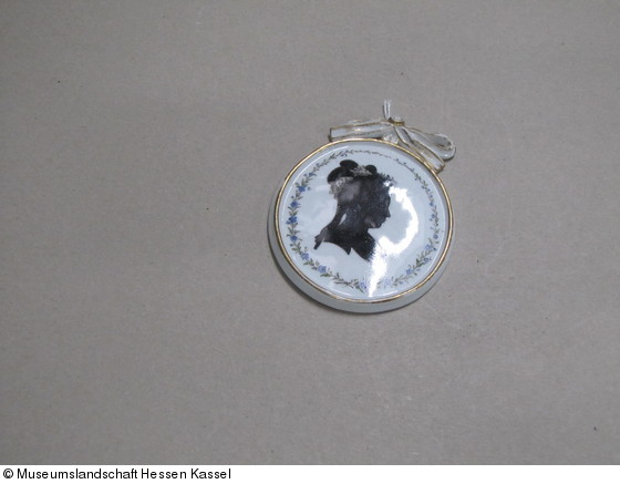 Medaillon mit Silhouette einer Dame in Vergissmeinnichtkranz (wohl Frau Comissionsrat Landvogt, geb. Dotter, gest. 1803 in Havelstein) |