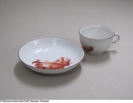 Tasse und Untertasse mit Fluß- und Ruinenlandschaft in Eisenrot |