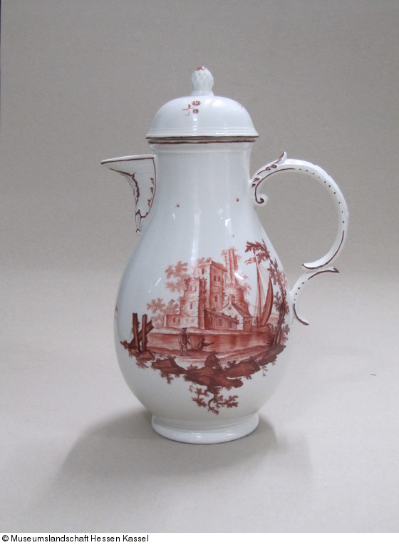 Kaffeekanne mit Fluß- und Ruinenlandschaft in Eisenrot |