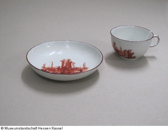 Tasse und Untertasse mit Fluß- und Ruinenlandschaft in Eisenrot |