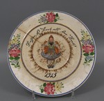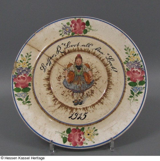 Großer Teller mit Wächtersbacher Rose, Mädchen in Schwälmer Tracht und Umschrift: "Besser "K." Brot als "kaa" Brot!" 1915 |