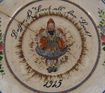Steingut, mehrfarbiger Druckdekor, glasiert. Rückseitig zwei Bohrungen zum Aufhängen. |