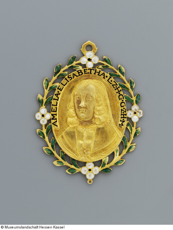 Die kunstvoll gearbeitete Porträtmedaille der Landgräfin Amalie Elisabeth von Hessen-Kassel stellt ein besonderes Kleinod unter den Münzen und Medaillen der Kasseler Sammlung dar. Der goldene Anhänger zählt zu den sogenannten Gnadenpfennigen, die bis ins 17. Jahrhundert für besondere Verdienste und als Zeichen großer Gunstbezeugung von Herrschern an ausgewählte Personen verliehen wurden.