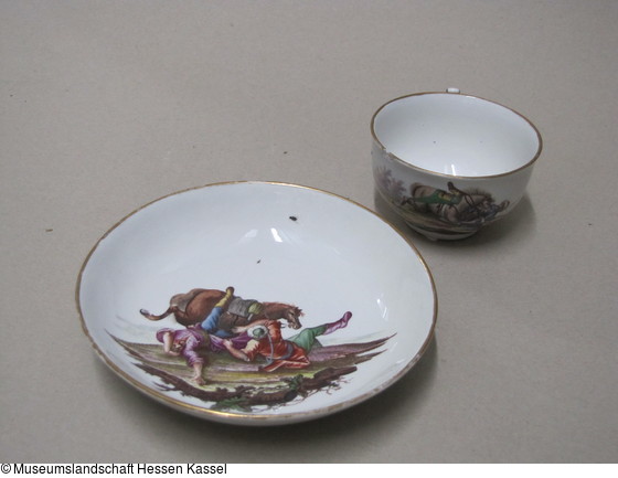 Tasse und Untertasse eines Services mit Kampfszenen aus dem Türkenkrieg |