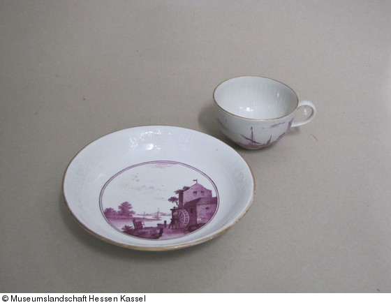 Porzellan, bemalt in Purpur Camaieu, goldstaffiert |