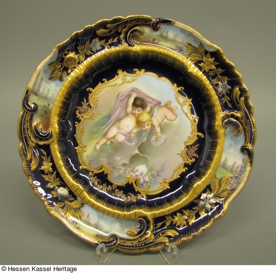 Porzellan, formgefertigt. Aufglasurbemalung in Kobaltblau und naturalistischen Farben, die Bilder im Spiegel in Umdruck, Goldstaffierung. |