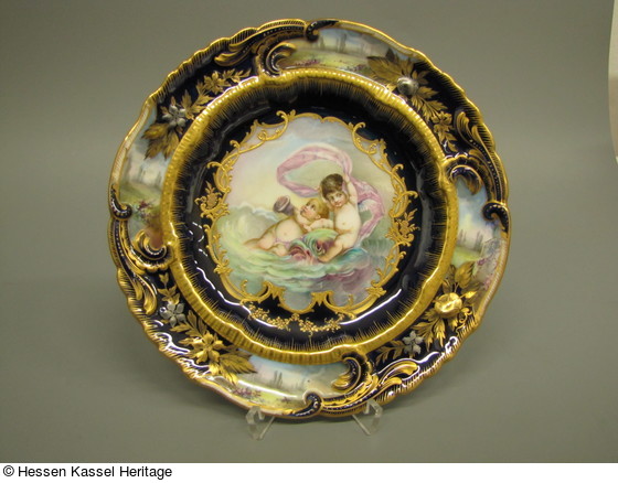 Porzellan, formgefertigt. Aufglasurbemalung in Kobaltblau und naturalistischen Farben, die Bilder im Spiegel in Umdruck, Goldstaffierung. |