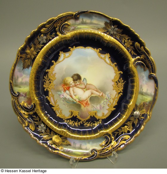 Porzellan, formgefertigt. Aufglasurbemalung in Kobaltblau und naturalistischen Farben, die Bilder im Spiegel in Umdruck, Goldstaffierung. |