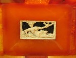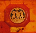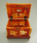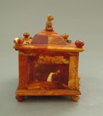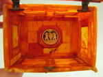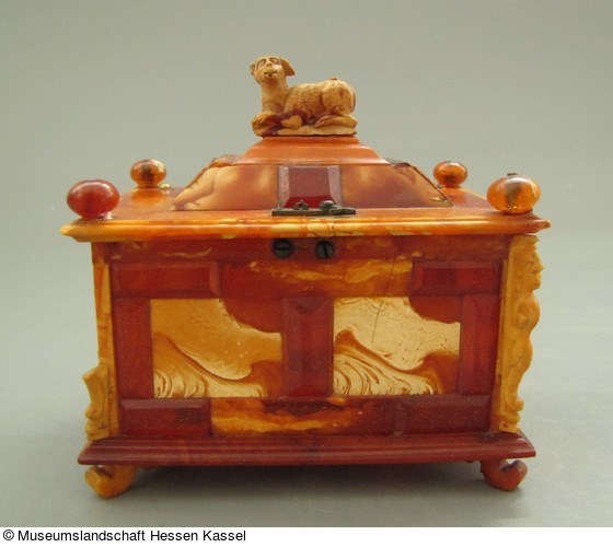 Kleines Bernsteinkästchen mit Hund auf dem Deckel