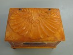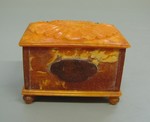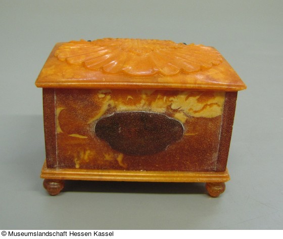 Bernstein, gesägt, geschnitzt und poliert, Füße gedrechselt, Goldfolie, Kupferlegierung vergoldet (Beschläge), Eisen gebläut (Schrauben) |