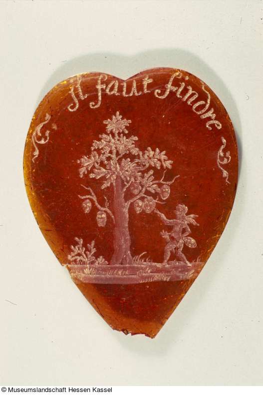 Drei herzförmige Plättchen mit gravierten Amorszenen (Spielmarken)