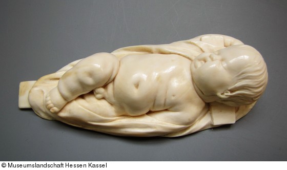 Ein Knabe mit beachtlicher Leibesfülle liegt schlafend in ein Tuch gehüllt auf einem Kreuz. Dessen Balkenenden kommen rechts und links des Kopfes und unterhalb der gekreuzten Beinchen zum Vorschein. Ein Ärmchen ist unter den Kreuzbalken am Kopf geschoben, das andere liegt, vom Tuch überdeckt, neben dem Körper. Auch eines der Beinchen verliert sich im Gewand, während das andere frei darübergekreuzt ist. Der kleine Körper wirkt wohlgenährt. Weiche und untersetzte Formen prägen dessen Gestalt. Obgleich der Knabe auf dem Rücken liegt und nur das übergeschlagene Beinchen eine leichte Körperdrehung andeutet, sackt der voluminöse Bauch zur Seite. Dicke Bäckchen, die mit strengen Naso-Labialfalten vom kleinen Mund abgegrenzt sind, prägen das Gesicht. Der gesamte Körper, der keine Knochen erahnen lässt, wird von adipös wirkenden Fettpolstern bestimmt. Der sogenannte "Babyspeck" des Kindes wird gezielt herausgearbeitet und betont, wo immer es möglich ist..
