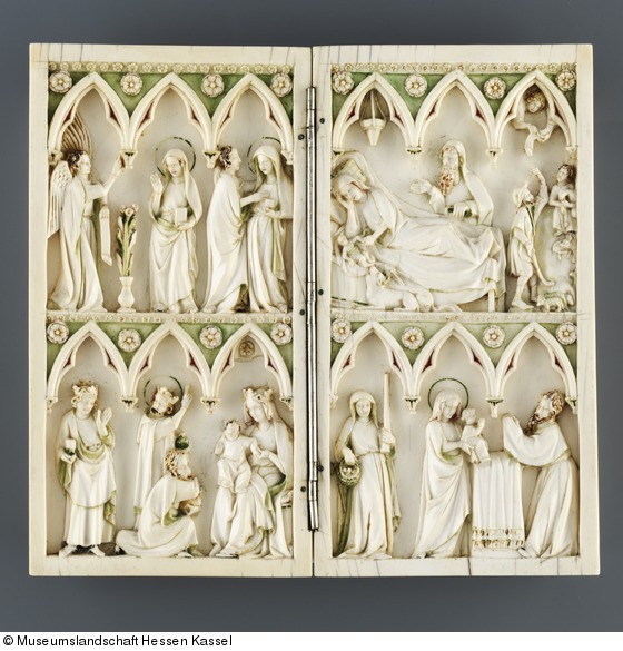 Seit dem 13. Jh. erfreuten sich in Adelskreisen kleine Klappaltäre aus Elfenbein mit Szenen aus dem Leben Christi und Mariens, die auch auf Reisen genutzt werden konnten, großer Beliebtheit.