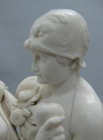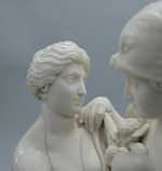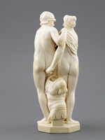 Elfenbein, gesägt, geschnitzt, gebohrt und poliert. Der Strauß zwischen den Figuren ist eingesteckt |