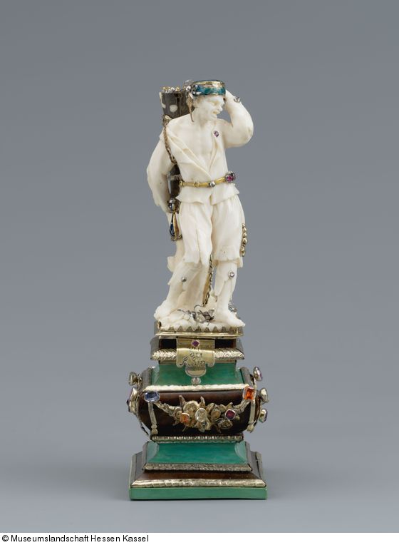 Elfenbein, am Sockel grün gefärbt; Silber, vergoldet; verschiedene Edelsteine; Glas; Email; Holz; Schildpatt; Lackfarbe |