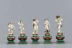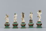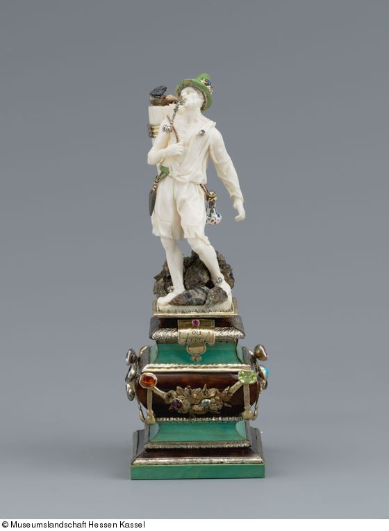 Elfenbein, am Sockel grün gefärbt;; Silber, vergoldet; verschiedene Edelsteine; Glas; Email; Holz; Schildpatt; Lackfarbe |