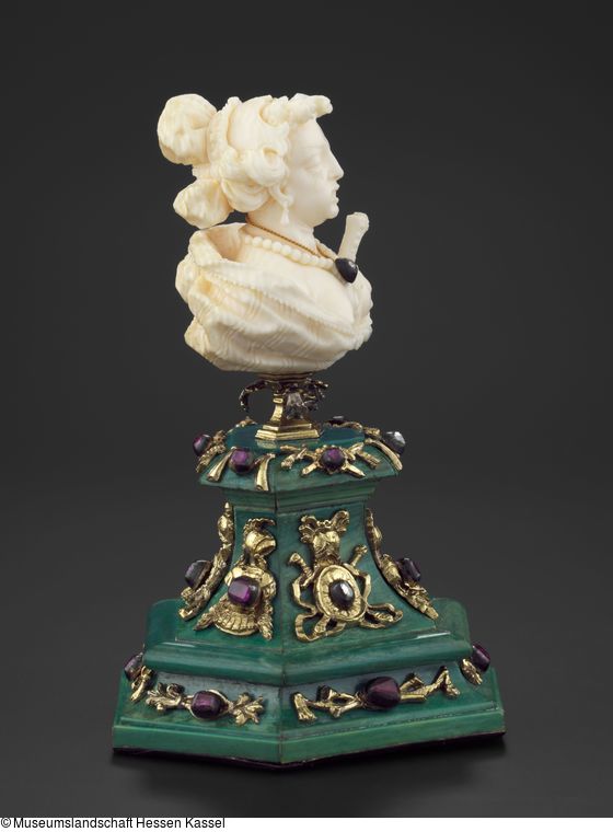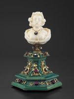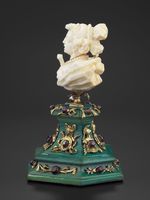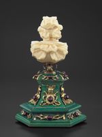 Elfenbein, geschnitzt, poliert; Sockel: Elfenbein, grün eingefärbt; Silber, getrieben, vergoldet; Edelsteine (Diamanten, Rubine?) |