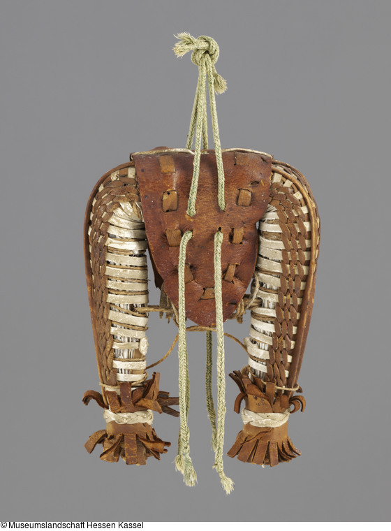 Leder, Textil, Bast od. Hanfschnur (?), Federkiele |