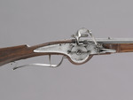 Das Jagdgewehr mit französischen Radschloss besticht durch seinen schlanken, gestreckten Schaft und das zurückgenommene, elegante Dekor. Allein auf der Gegenschlossseite ziert als größeres Dekorelement eine dezent gearbeitete Rosette den Schaft. Auch Lauf, Schloss und Abzugsbügel präsentieren sich frei von ornamentalen Verzierungen.