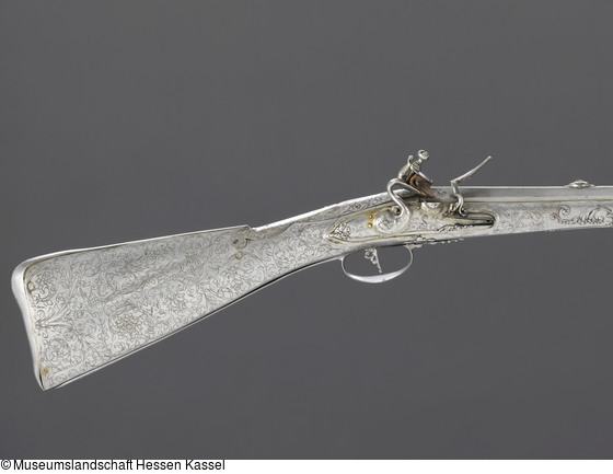 Die Kasseler Garnitur bestehend aus einer Steinschlossflinte und einer ursprünglich zu einem Paar gehörenden Steinschlosspistole (KP B XIV.91b). Die Schlösser beider Waffen tragen die Signatur Stefano Solis. Die Läufe sind hingegen von Gironimo Mutto (erwähnt 1720-1731) bezeichnet, einem in Gardone Val Trompia bei Brescia tätigen Laufschmied. Flinte und Pistole sind über und über mit floralem Ätzdekor und geschnitten Stahlornamenten dekoriert. Die Zusammenarbeit mehrerer Meister war für die Herstellung einer so hochqualitativen Waffe durchaus gängige Praxis.