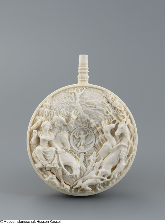 Der Körper der elfenbeinernen Pulverflasche zeigt auf der Vorderseite Szenen verschiedener Jagden. Dazu bediente sich der heute unbekannte Künstler virtuos der Techniken des Flach- bis Dreiviertelreliefs. Der Vordergrund der linken Seite wird von einem höfischen Paar in eleganter Kleidung und hoch zu Ross eingenommen. Die im Damensattel reitende Frauenfigur hält dabei auf ihrer erhobenen rechten Hand einen bekappten Jagdfalken. Auf der rechten Seite spielt sich derweil die dramatische Szene einer Hirschjagt ab: Mehrere Hunde packen einen flüchtenden Hirschen und eine Hirschkuh. Hinter diesen beiden Szenen öffnet sich der Blick des Betrachters über das Dickicht des Waldes hinweg auf eine entfernte Lichtung, auf der wiederum mehrere Hunde einem wartenden und mit einer Saufeder bewaffneten Jäger einen Keiler entgegentreiben. Dahinter, am obersten Rand der Bildfläche, zeichnen sich die Umrisse einer fernen Stadt ab. Das zentrale Medaillon zeigt hingegen keine Jagdszene, sondern die für die Jagd so wichtige Glücksgöttin Fortuna, hier als Personifikation nach antikem Vorbild auf einer Kugel stehend (bzw. kauernd), in den Händen ein geblähtes Segel haltend. Die Rückseite der Pulverflasche ist als vielpassige Rosette gearbeitet.