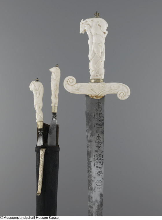 Der Griff, die s-förmige Parierstange und die Griffe der beiden Beimesser dieses außergewöhnlichen Jagddegens bestehen aus plastisch geschnitzten Elfenbeinarbeiten von herausragender Kunstfertigkeit. Das Heft des Degens ist aus den Körpern der im Kampf verschlungenen Hirsche, Keiler und Jagdhunde gestaltet. Die s-förmige Parierstange zeigt auf der Rückseite eine grimmig dreinblickende Maske, auf der Vorderseite hingegen den Kampf eines Keilers gegen mehrere Jagdhunde. Der Künstler muss mit den zur Jagd eingesetzten Hunderassen vertraut gewesen sein, so sind die hier von ihm dargestellten Hunde deutlich als die zur Schwarzwildjagd eingesetzten doggenartigen Sauhunde oder „Saupacker“ zu erkennen, die ab dem 16. Jahrhundert zu diesem Zweck aus England importiert wurden. Auch die Elfenbeingriffe der beiden Beimesser zeigen dramatische Kampfszenen: Die Körper ineinander verschlungen, hält einer der schlanken und langschnauzigen Hetzhunde einen Hasen an der Kehle gepackt. Die Elfenbeinschnitzerei des zweiten Beimessers zeigt einen eben solchen Jagdhund, verbissen in die Kehle eines Fuchses.