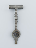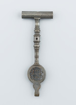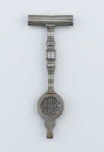 Der als doppelseitiger Vierkantschlüssel gearbeiteten Radschlossschlüssel ist aus massivem Eisen gefertigt. Der balusterförmig abgesetzte Schaft endet in einem Schraubenzieher mit geschnittenem Ornamentknotendekor.