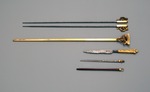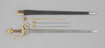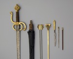 87,4 cm (Länge) Degen (LxBxT): 87,4 x 15 x 2,7 cm (Objektmaß) Scheide (LxBxT): 77,7 x 5 x 3,4 cm (Objektmaß) Kaliberstab klein (LxBxT): 18,4 x 1,5 x 0,4 cm (Objektmaß) Geschützrichter (LxBxT): 40,6 x 4,2 x 1,7 cm (Objektmaß) Rundstäbe mit Gewindespitzen (LxBxT): 37,8 x 2,4 x 0,7 cm (Objektmaß) Messer (LxBxT): 19 x 1,7 x 0,7 cm (Objektmaß) Holzpfriem (LxBxT): 16 x 1 x 0,7 cm (Objektmaß) Messingpfriem (LxBxT): 15,3 x 0,7 x 0,8 cm (Objektmaß)