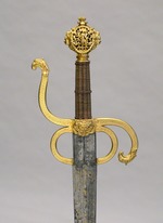 Der Prunkdegen mit Büchsenmeisterbesteck stammt aus dem Besitz Landgraf Moritz’ des Gelehrten. Christoph Trechsler (1546–1624) fertigte das Ensemble 1609 in Dresden an und signierte es mit den Initialen CTM (Christoph Trechsler Mechanicus) sowie der Jahreszahl 1609. Die elegante Blankwaffe besitzt ein aufwendig gestaltetes Gefäß, dessen Knauf durchbrochene Reliefs mit Venus und Amor sowie rückseitig ein von zwei Händen gehaltenes Herz zieren.