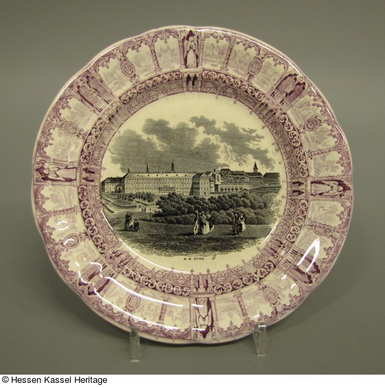 Steingut, weißer Scherben, gedruckter Dekor in zwei Farben, schwarz und violett (Umrahmung). |