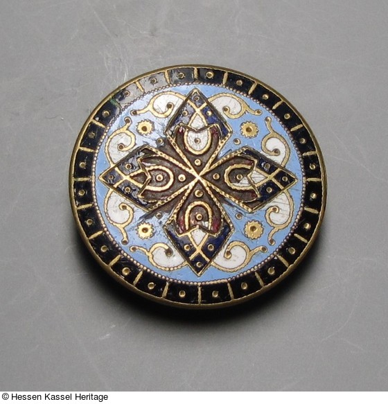 Bronze gegossen, punziert, vergoldet; opakes Zellenemail in Schwarz, Hellblau und Weiß.