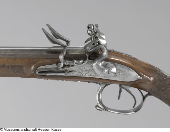 Die Waffe ist eine Kombination aus einer Steinschlossflinte der Mitte des 18. Jahrhunderts mit einem Schaft des frühen 19. Jahrhunderts. Der Gewehrlauf und das Schloss des französischen Waffenschmieds Isidore Brézol müssen zwei Generationen nach ihrer Entstehung noch so hoch geschätzt worden sein, dass Kurprinz Wilhelm (II.) von Hessen-Kassel (1777-1847) die metallenen Bauteile der Waffe in Kassel mit einem neuen Schaft versehen ließ. Auf einer versilberten Daumenplatte brachte man das Monogramm Wilhelms an („WKP“ für Wilhelm Kurprinz).