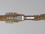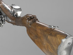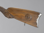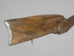 Auffälligstes Zierelement des ansonsten schlichten und schmucklosen Schafts aus Nussbaumholz ist eine geschnitzte Maske am unteren Übergang des Kolbenhalses zum Kolben, deren weit aufgerissenes Maul das Gewehr zu verschlingen scheint.