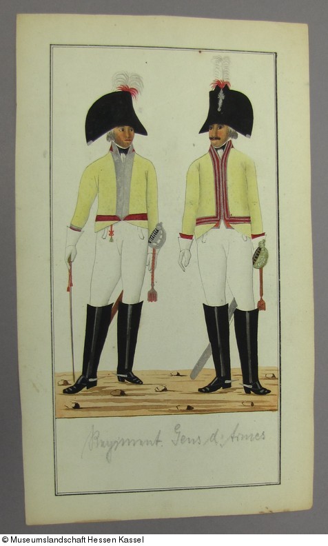 Federzeichnungen mit Uniformen der kurhessischen Armee: "Regiment Gens d'Armes"