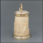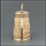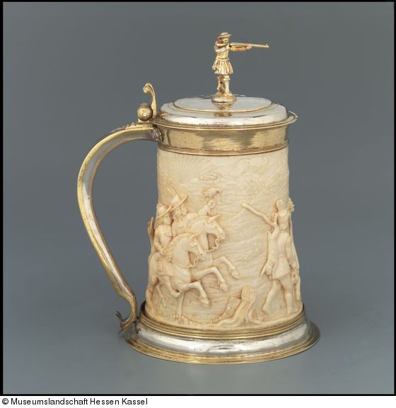 "Jagdhumpen. Elfenbeinwandung Reliefschnitzerei einer Jagdszene (umlaufend), silbervergoldete Fassung von Johann Hermann Ries, Kassel um 1680, als Deckelknauf kleine silberne Jägerfigur mit angeschlagener Büchse."