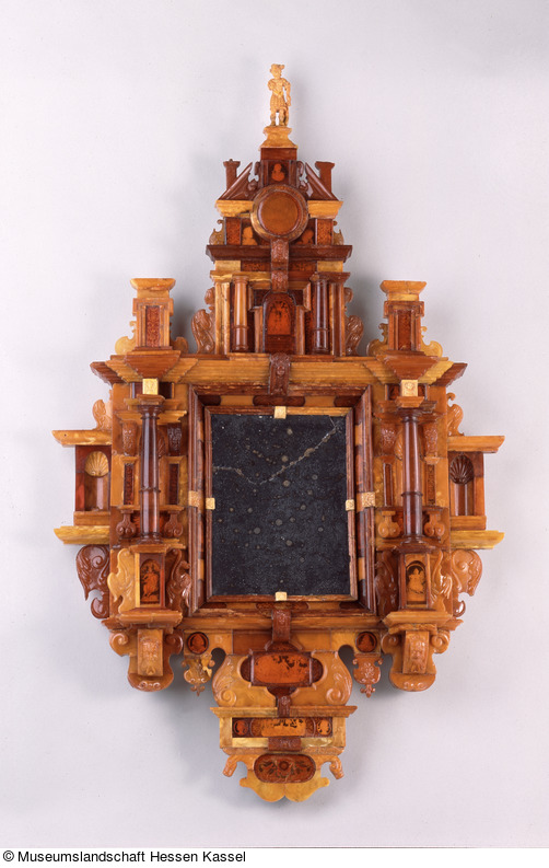 Bernstein, geschnitzt, gedreht, Knochenbernstein, geschnitzt; Holz; Spiegelglas, Eglomisé |