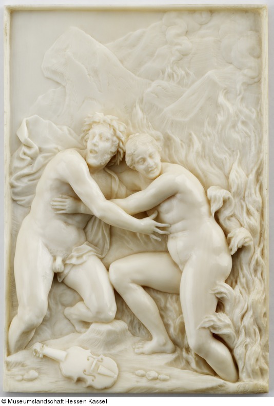 Spätestens Ende des 18. Jahrhunderts lässt sich das Relief im Besitz der Landgrafen von Hessen-Kassel nachweisen. Zusammen mit anderen Elfenbeinreliefs war es zunächst im Museum Fridericianum ausgestellt. Da Dobbermann seit 1716 als Bernstein- und Elfenbeinarbeiter am Hof Landgraf Carls von Hessen-Kassel angestellt war und bis zu seinem Tod 1745 in den Diensten der hessischen Landgrafen Friedrich und Wilhelm stand, ist es wahrscheinlich, dass das Relief schon früher in die landgräflichen Sammlungen gelangte. Möglicherweise war es eins der „Drei historische[n] stücke aus dem Ovidio, worfür gläser in schwartzem rahmen.“, die bereits 1747 im Kunsthaus hingen.
