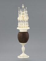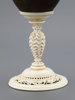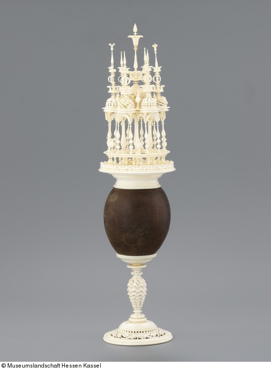 Der Kokosnusspokal mit einem Fuß und Deckel aus gedrechseltem Elfenbein kann als einzigartiges Kunstkammerstück und als seltenes Meisterwerk der Maschinenkunst gelten. Allein der Deckel besteht aus 188 Einzelteilen, die auf der Drehbank hergestellt, anschließend beschnitzt oder mit der Laubsäge weiterbearbeitet und schließlich zu einem phantasievollen Architekturgebilde zusammengefügt wurden. Dargestellt ist eine runde Säulenhalle, bei der ein innerer Stützenring die Mittelkuppel trägt, die von sechs kleineren Kuppeln auf weiteren Stützen umringt wird. Die Kuppeln sind nicht als geschlossene Kalotten gearbeitet, sondern so weit ausgesägt, dass nur noch kleine Elfenbeinstege oder Pflanzenranken stehen blieben. Diese äußerst filigrane Architektur wird bekrönt durch Zierspitzen, die in Blüten enden (die Blüten sind zum Teil verloren). Auf der Innenseite der Mittelkuppel hängt ein kleiner Vogel, sodass das Bauwerk als kleiner Gartentempel interpretiert werden kann. Auch die Kokosnuss, die die Trinkschale bildet, zeigt einen interessanten Befund. Auf ihrer Außenseite haben sich Reste von Anzeichnungen erhalten, die darauf hindeuten, dass ursprünglich eine Spange angebracht werden sollte. Möglicherweise war der Pokal demnach noch prachtvoller geplant und blieb in diesem Punkt unvollendet.