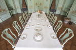 Kasten: Holz, Leder, Textil; Besteck: Messer Stahl, Porzellan, Aufglasurmalerei, Goldstaffage, Silber. Gabel und Löffel: Silber, Porzellan, Aufglasurmalerei, Goldstaffage |