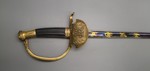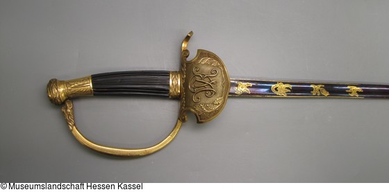 Der Degen besitzt ein vergoldetes Empire-Bügelgefäß mit abgebogenem Stichblatt, auf dem die separat gegossene, von Eichen- und Lorbeerblattkranz umgebene Buchstabenauflage WK (= Wilhelm Kurfürst) mit drei Nieten bündig befestigt ist.